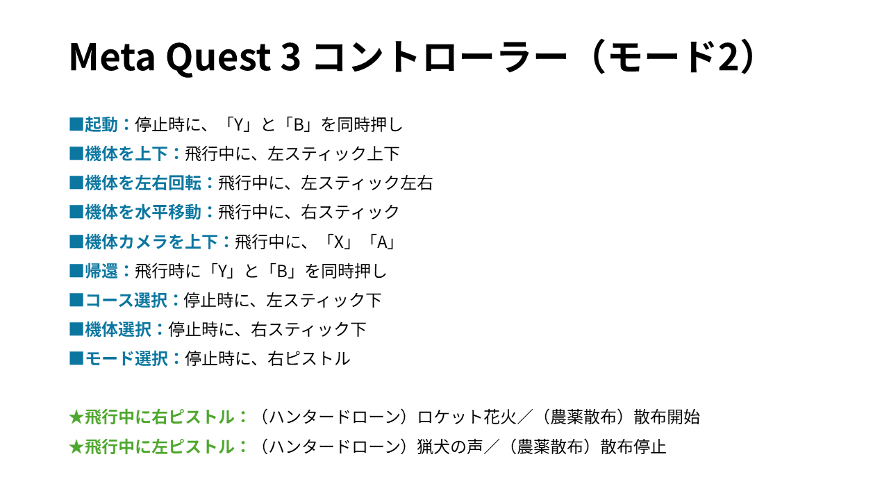 Meta Quest 3付属コントローラーの他、各種プロポ送信機による操作に対応しています。